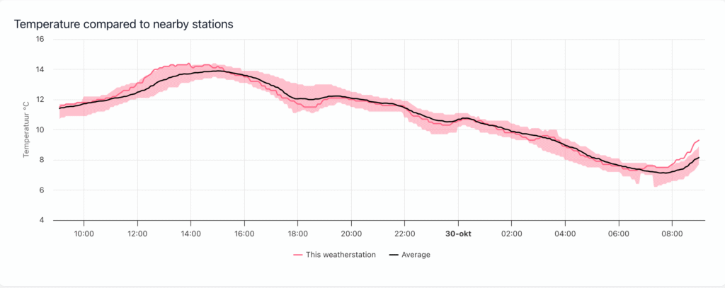 Ook de weerstations in de buurt zijn nu zichtbaar, standaard worden de 2 dichtste getoond, met een knop om alle stations in de buurt (25km, max 25 stations) te tonen, met een grafiek eronder om de temperatuur te vergelijken met de stations in de buurt.