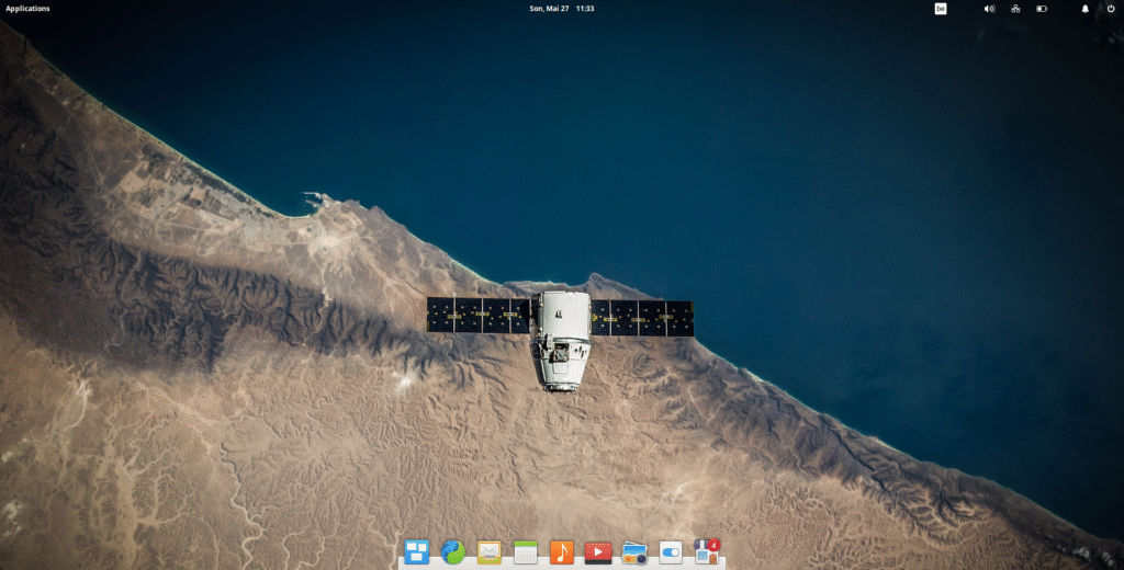zoals je ziet op de foto is de bureaublad omgeving heel simpel. De balk bovenaan bevat een applicatiemenu, een klok, systeemindicators en een aan-uit knop. onderaan is een dock met enkele app’s erop en deze verbergt zich wanneer er een programma over komt, zodat je altijd het meeste plek overhoudt voor je actieve programma’s