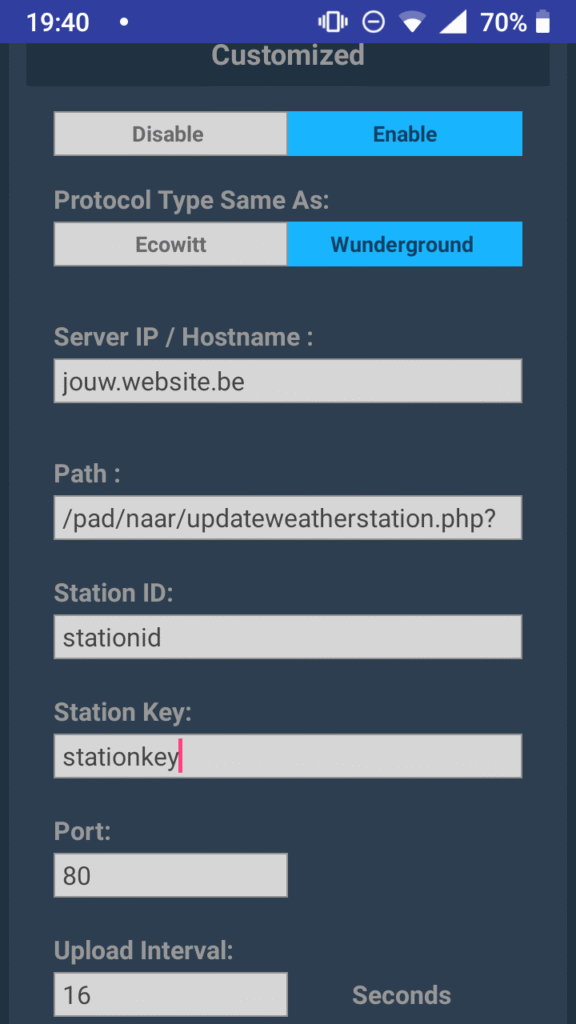 Bij `path` geef je aan waar dat uploadscript staat op jouw website, bijvoorbeeld `/weerstation/updateweatherstation.php?` **Let op: dit dient te eindigen met een `?`**