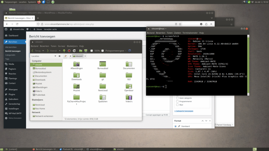 De afgelopen 3,5 jaar heb ik MacOS gebruikt (Ik had toen een Macbook air gekocht zodat ik een iOS versie van Skyz kon maken), daarvoor heb ik eigenlijk altijd Linux gebruikt en slechts enkele keren Winows (eigenlijk enkel voor school). Met dat ik de app-versies van skyz niet meer ondersteun omdat het te veel werk was om deze te beheren en Apple geen leuke kant op gaat met MacOS 26 ben ik terug naar mijn oude pc gegaan met Linux (Helaas is het bijna onmogelijk om Linux te draaien op een Mac met een AppleSilicon CPU). Ik draai nu Debian Trixie, al heb ik het Theme van een oude Ubuntu Mate erop geïnstalleerd, aangezien ik dit thema altijd gebruikt heb.