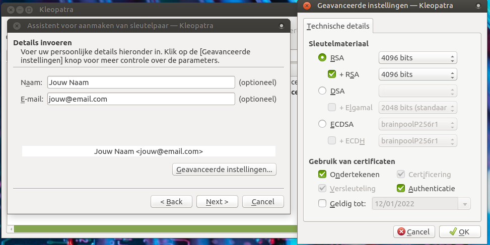 Ik raad persoonlijk aan om een vervaldatum op een sleutel te zetten, bijvoorbeeld een jaar, of enkele jaren. Hierna maak je gewoon een nieuwe aan, die dan weer een jaar of enkele jaren geldig is. Als key gebruik je best RSA 4098 bits of een ECDSA key (ECDSA is veiliger als RSA, al is RSA 4098 ook voldoende sterk.), zoals je kan zien in de screenshot hieronder. Ik maak hier gebruik van RSA 4098 bits