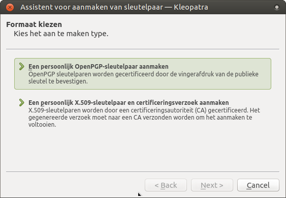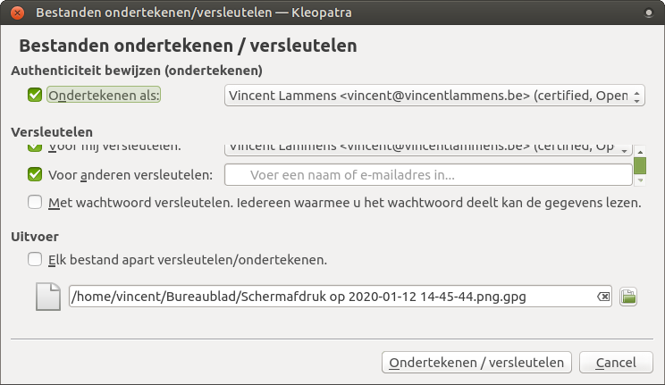 Ik raad het gebruik van kleopatra als gui voor GPG aan. GPG en kleopatra is op Debian/Ubuntu te installeren met apt install gpg kleopatra -y en op Windows computers kan er gebruik gemaakt worden van gpg4win, GPG4Win installeert ook nog enkele extensies voor outlook.