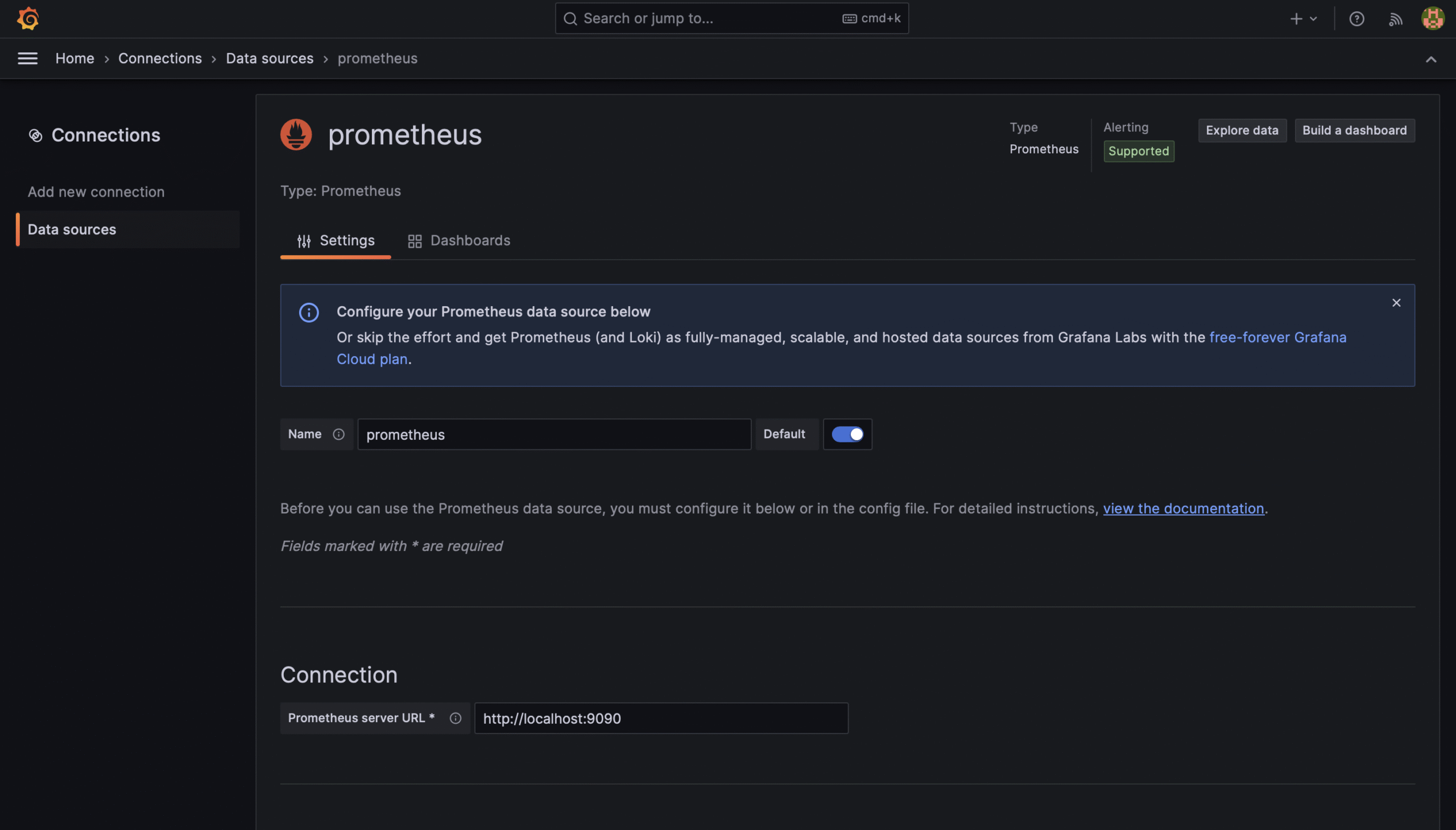 Eens ingelogd, kunnen we onze eerste databron toevoegen. Klik op “Add your first datasource”, selecteer prometheus en vul “http://localhost:9090” in als de URL naar prometheus.
