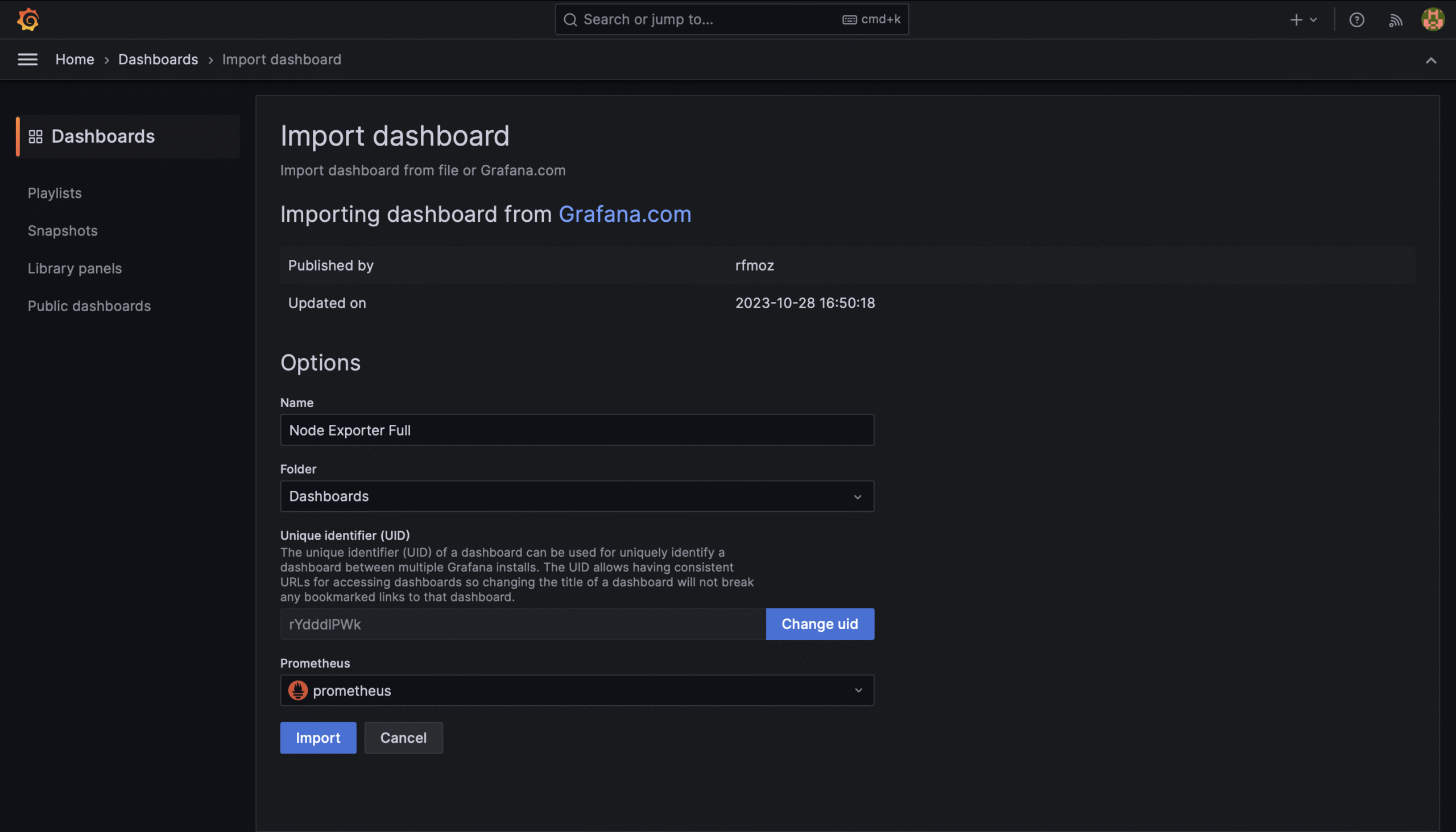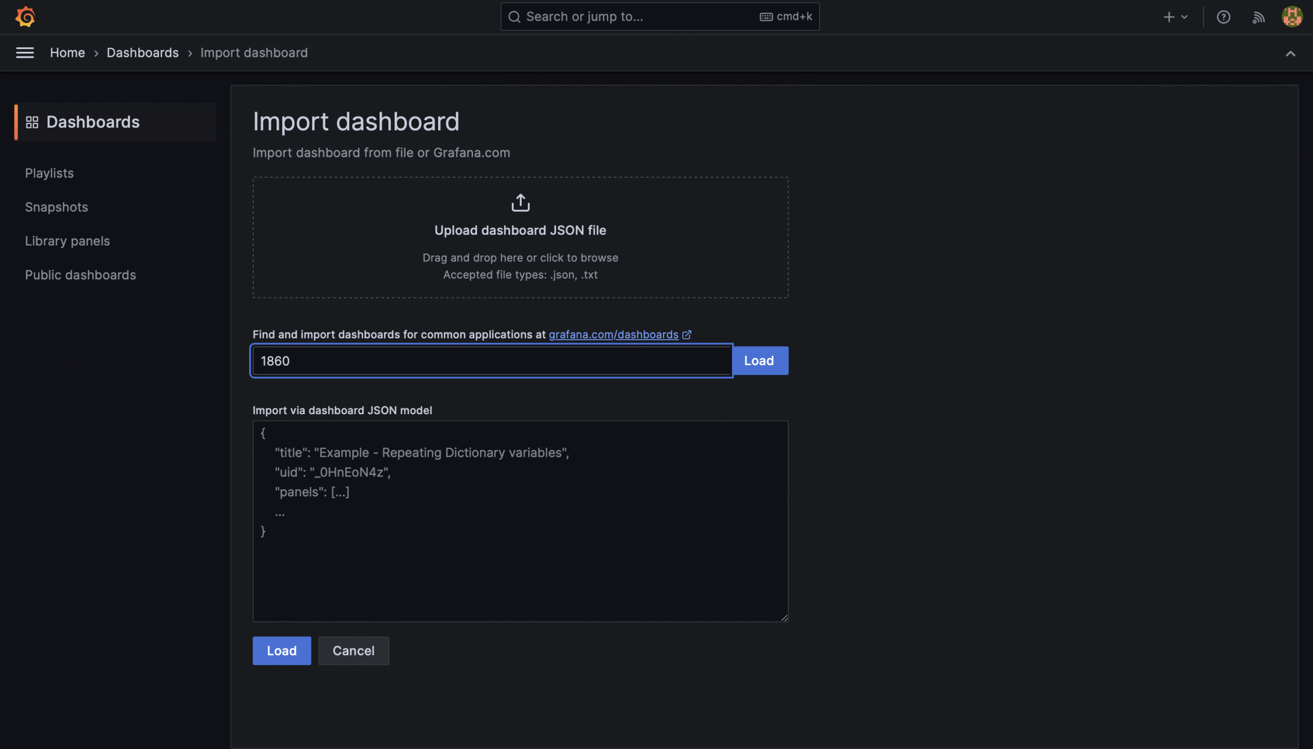 Vervolgens kunnen we terug naar het startscherm gaan en klikken op “Add your first dashboard”. Klik op “Import dashboard” en voeg “1860” in als het ID, en klik op “load”.